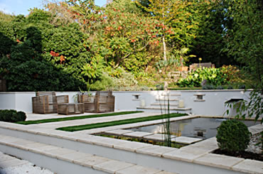 This contemporary Deco-inspired garden is theatrical in concept, the 'Club Chair' overtones of the Sunset Collection work well in this setting.